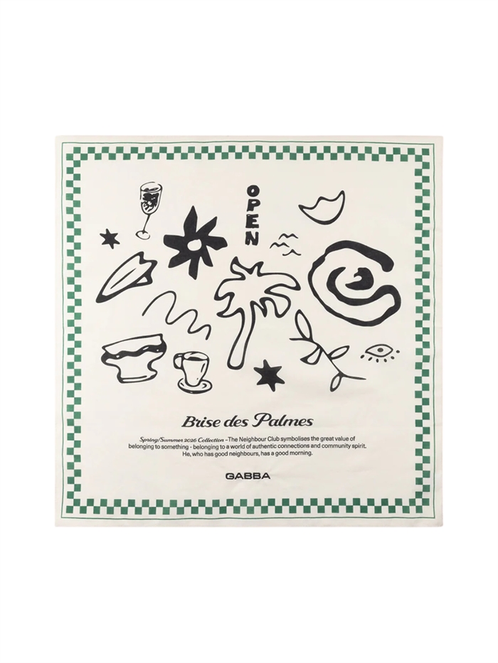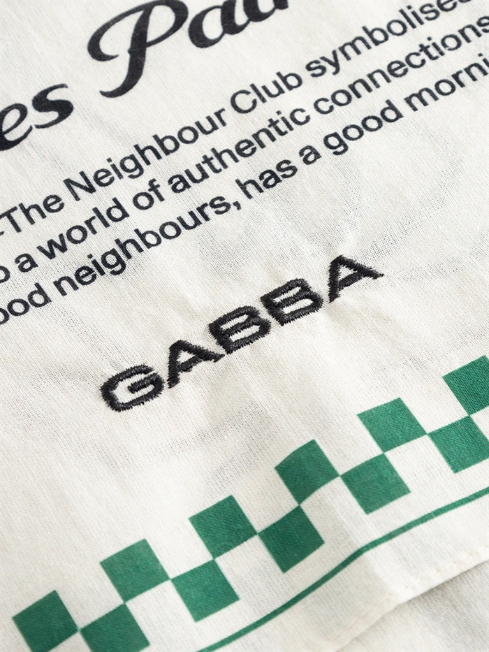 En blød og alsidig bandana lavet af en bomulds-elastisk blanding, designet til at komplementere ethvert look. Som en del af The Neighbour Club-temaet har den det karakteristiske GABBA-logo, hvilket gør den til et diskret statement-stykke, der hylder fællesskab og identitet. Et stilfuldt tilbehør med attitude og formål.