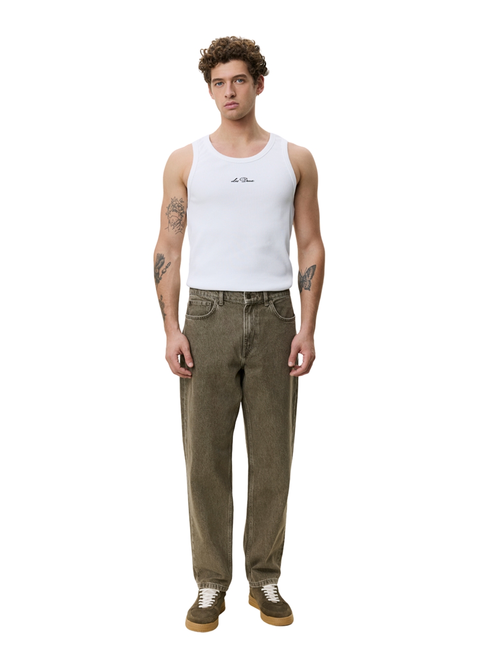 Les Deux Ryder jeans er fremstillet i 100 % økologisk bomuld, har en afslappet pasform og er afsluttet med det traditionelle jacronmærke bagpå.