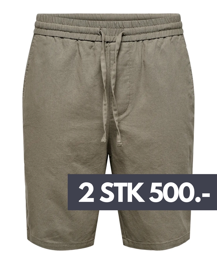 Only & Sons Linus bomuld-hør shorts i en mørk sand. De perfekte sommer shorts som ikke sidder til og i blødt, let og lækkert materiale. Der er en baglomme, 2 forlommer og elastik og snøre i livet