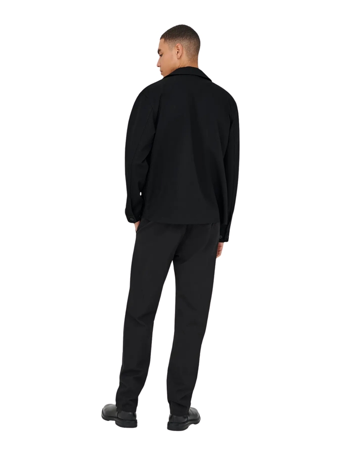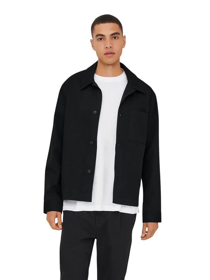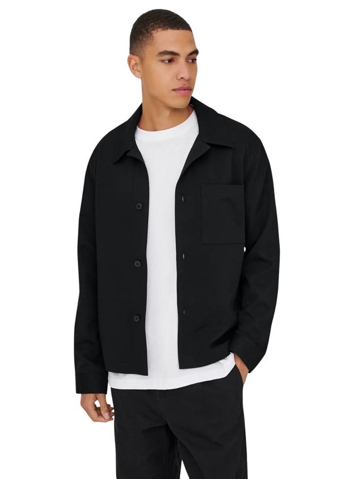 Denne stilige overshirt fra ONLY & SONS er perfekt til både afslappede og mere formelle looks. Den sorte farve og den skræddersyede pasform giver et elegant udtryk, mens de praktiske knapdetaljer gør den ideel som en let jakke eller skjorte. Et alsidigt must-have til din garderobe.