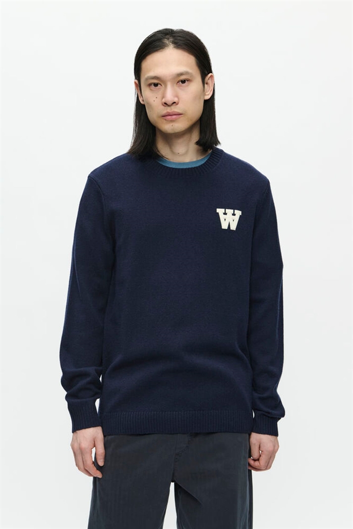 Tay L Striktrøjen fra Wood Wood er en klassisk og alsidig sweater i en let meleret blå farve. Den er strikket i en blød og behagelig kvalitet, der gør den perfekt til kølige dage. Det minimalistiske design med det diskrete 'W'-logo på brystet giver et rent og moderne udtryk, der passer til både hverdag og mere formelle anledninger. Et stilrent valg til garderoben, uanset sæson.